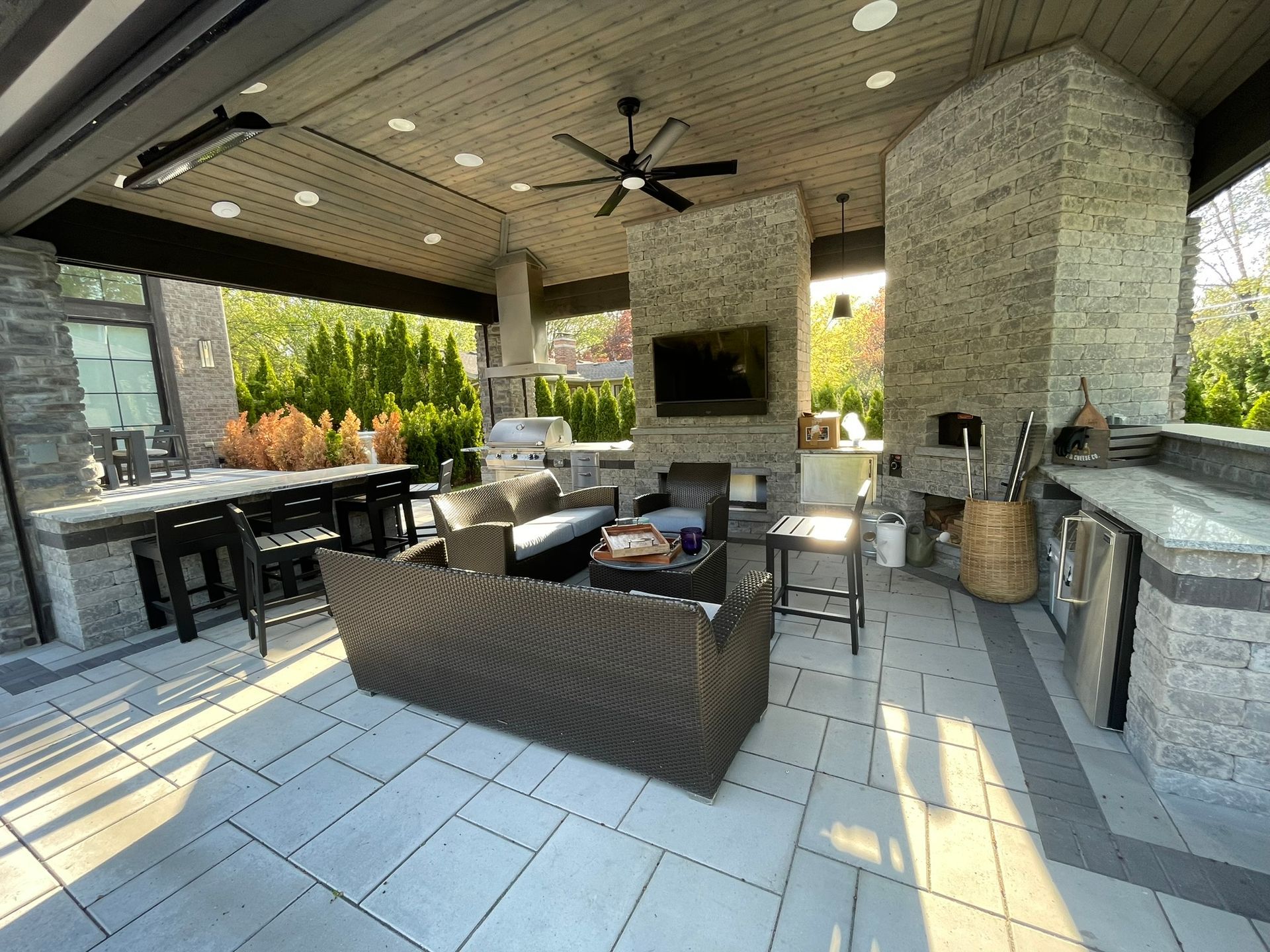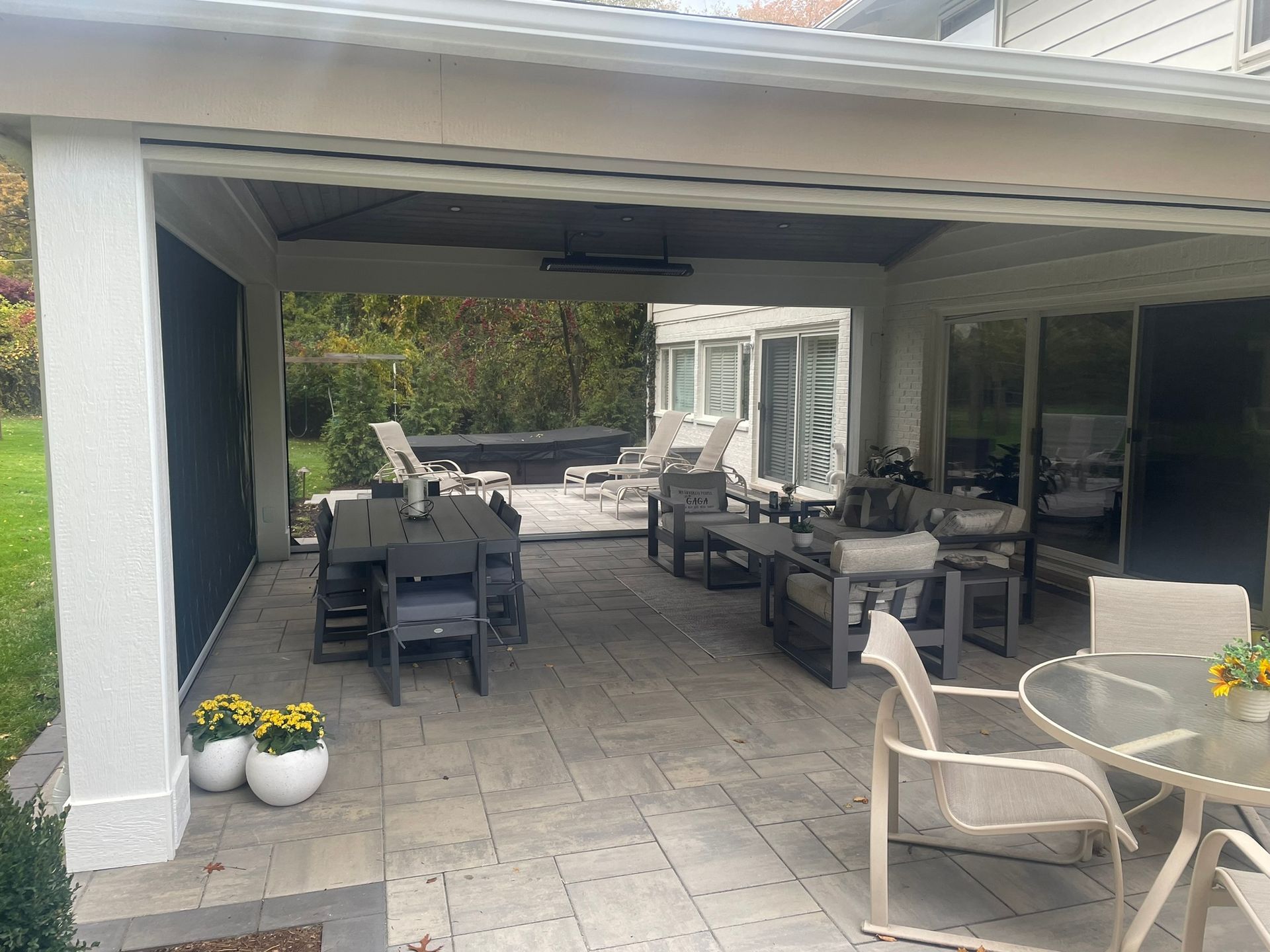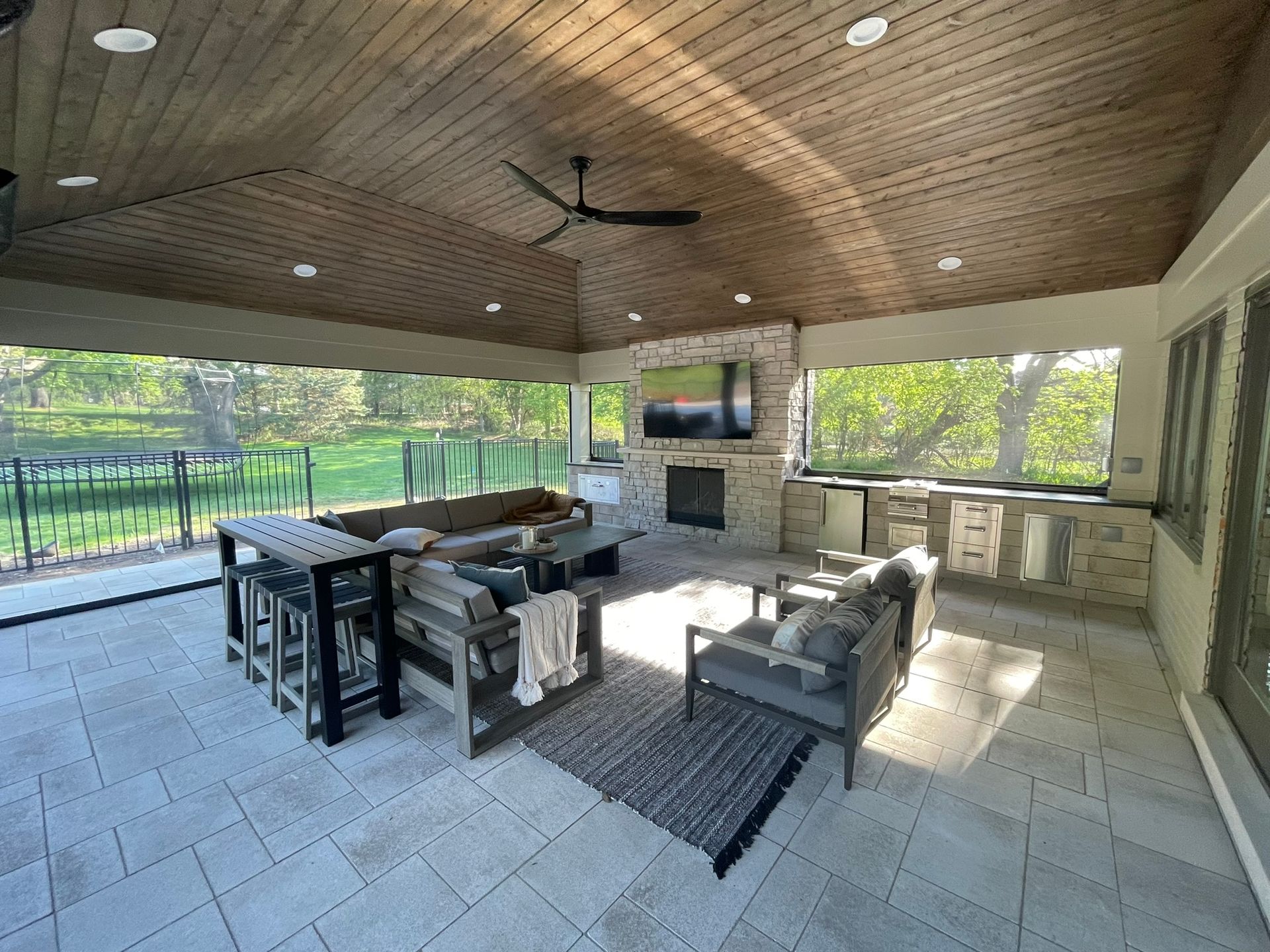 An outdoor living room can be a romantic spot for drinks by the fireplace or fire feature or enjoy the latest sporting event with family and friends with a television. Cozy patio furniture and can curtains complete the outdoor living room look and feel. With all the options offered today and with our guidance we can make your outdoor space is as comfortable as your indoor living room but with a better view of nature.