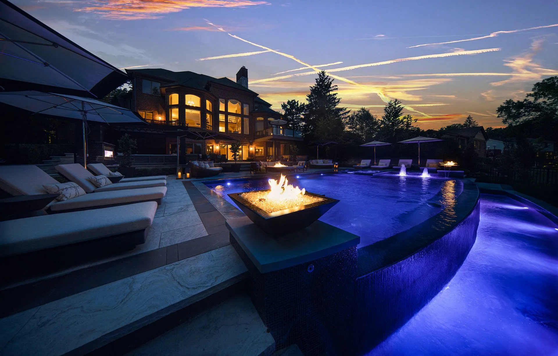 Fire feature, custom hardscape, planting design